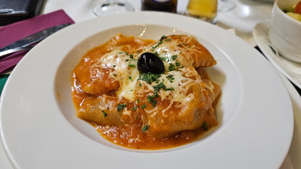 After showers back at the holiday house, tonight the 6 of us drove to nearby Silveira and enjoyed another wonderful dinner, this time in the Fonte Cuisine. I had ‘Beetroot ravioli with goat cheese and olive filling, (perfectly cooked) sauted vegetables and little crunchy squares of garlic toasts.
