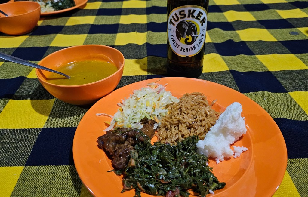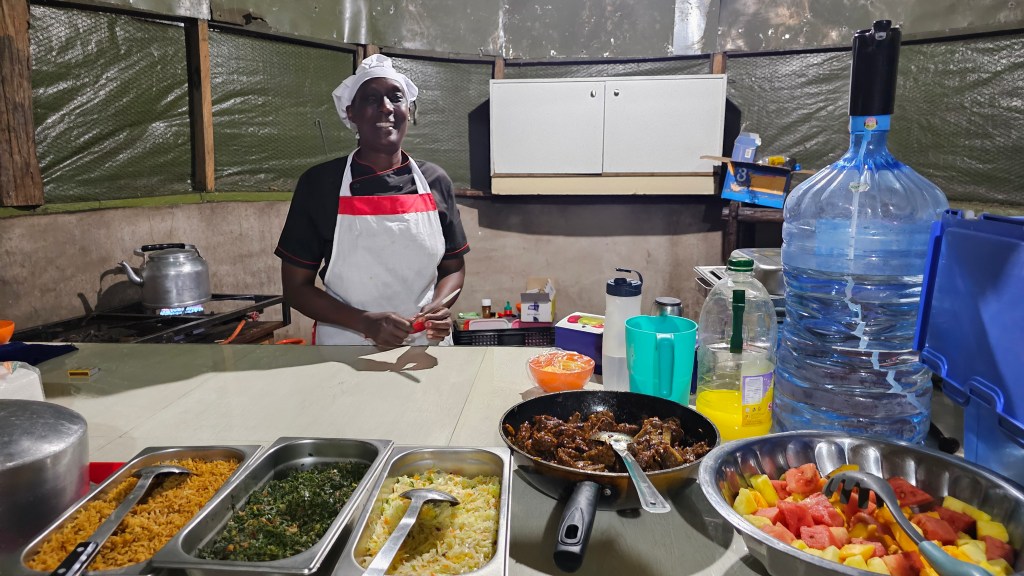 And to finish off, back at the campsite chef Judy had prepared a traditional Kenyan feast for our final dinner together as a group. This included lamb, polenta and kale and she showed us the way this is eaten is by rolling the polenta together with the kale and eating it with your fingers together with a piece of lamb.
