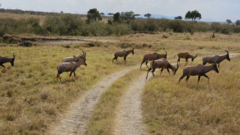 Topi antelopes crossed over the track in front of us, these are also known as Africa Gazelles as the black mark on their back is the shape of a map of Africa.