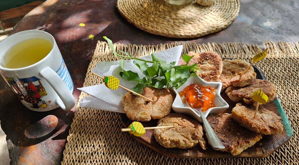However she welcomed us in and was happy to cook some delicious ad hoc banana fritters together with a mug of fresh ginger tea each which was perfect. And using ingredients from her garden.