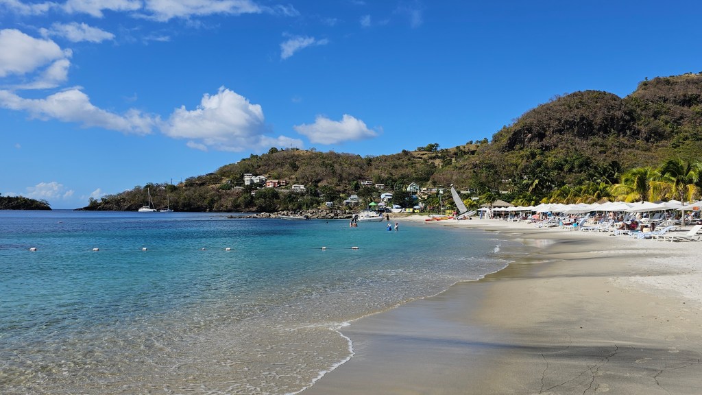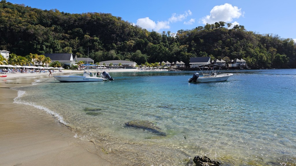 Non-Sandals guests are permitted to enjoy the immaculate golden sands and crystal clear lapping waters for free at this end of Buccament Bay. You need to pass through the Sandals security patrol and assure them you will not enter the resort or use their beach umbrellas!