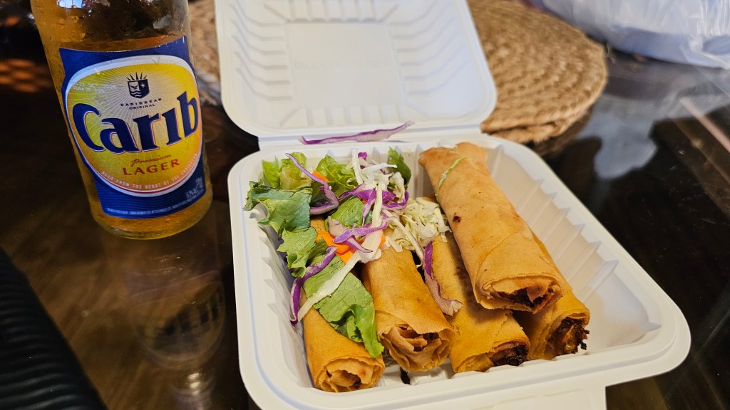 A takeaway of 2 portions of spring rolls and vegetable chow mein from Dewis in our little treehouse was our option for the first evening.