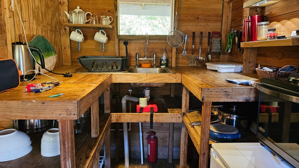 The treehouse had a small yet practical kitchen which included a fridge, kettle and various utensils.