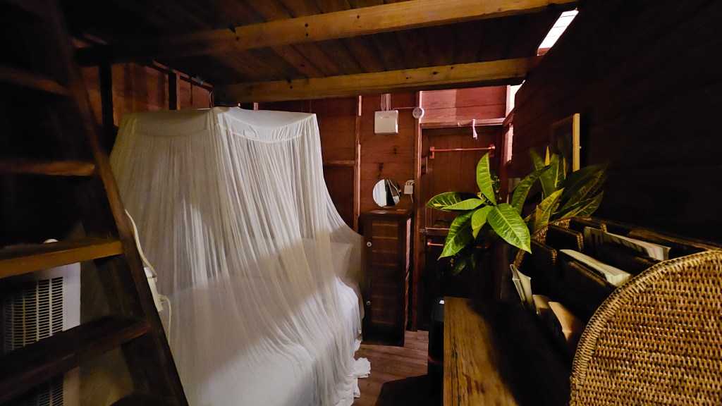 The bed was covered by a mosquito net which made a snug and cosy nest although other than the regular appearance of a small green lizard and a smallish spider, we didn’t see any mosquitoes inside the treehouse.
