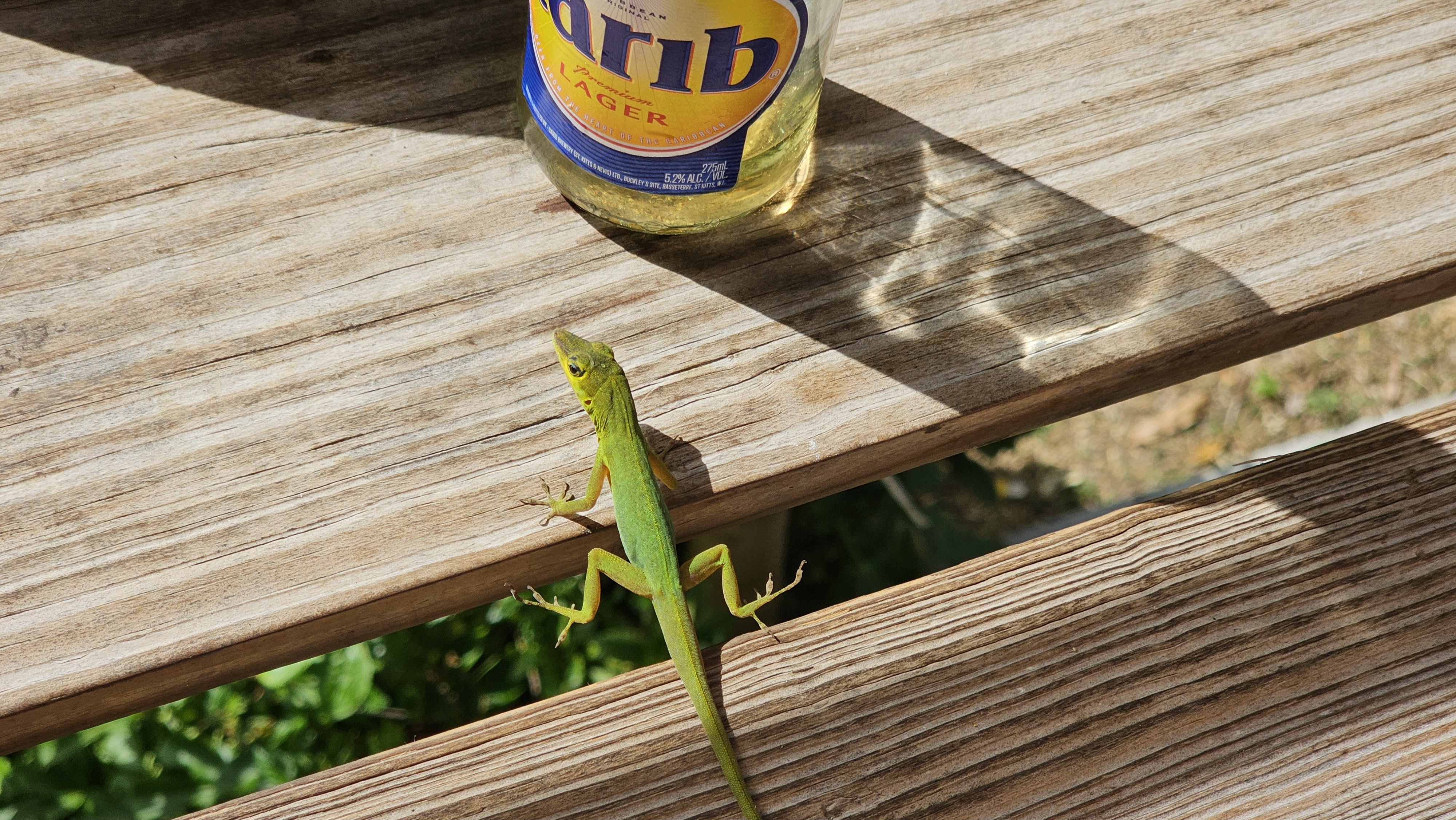 Back at the treehouse relaxing on the deck with a cold beer, salted peanuts and sea salt popcorn when another friend came to join us.