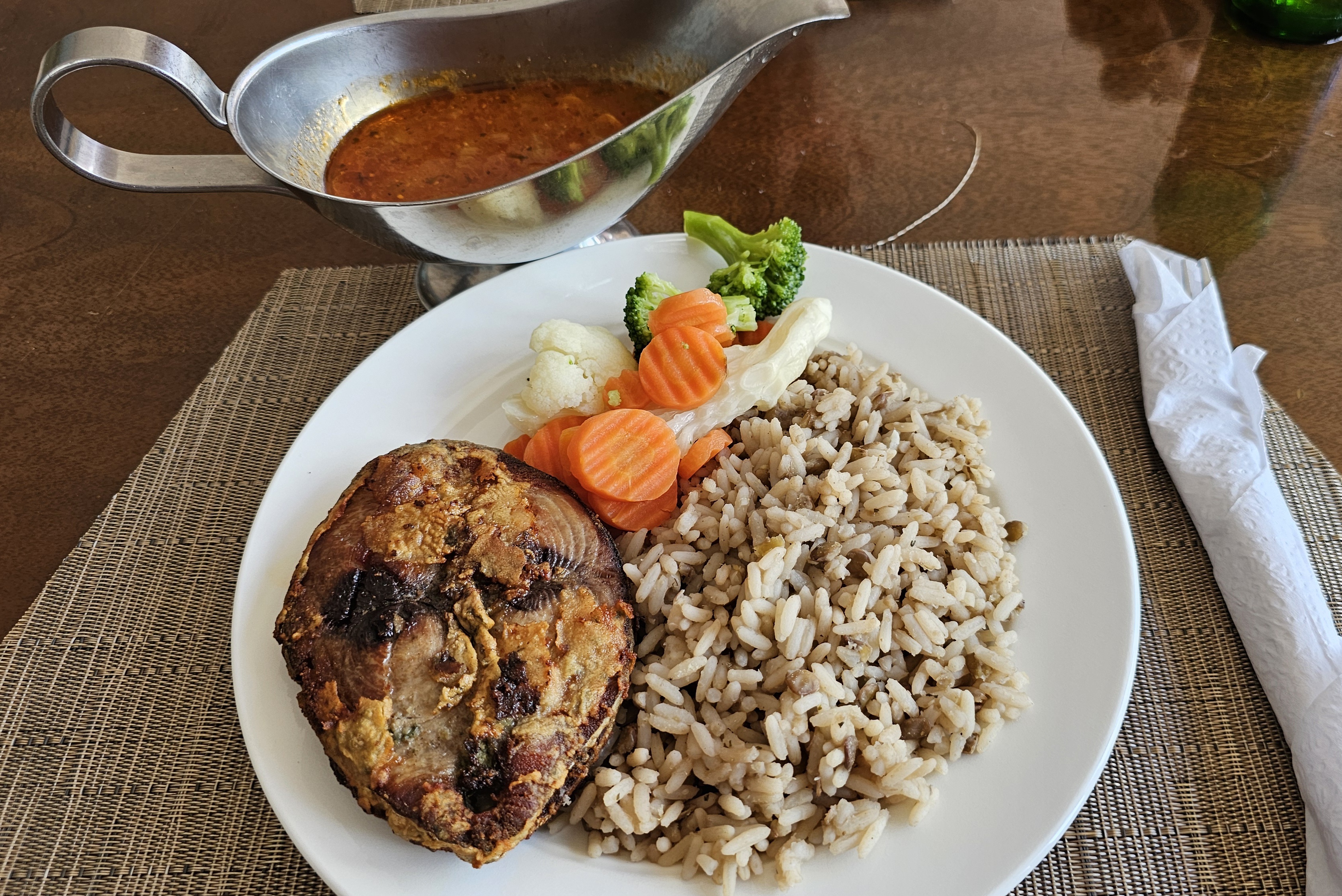 I had grilled tuna with rice, steamed veg and a gravy boat of creole sauce. Creole sauce is a mild spicy sauce popular in West Indian cuisine.