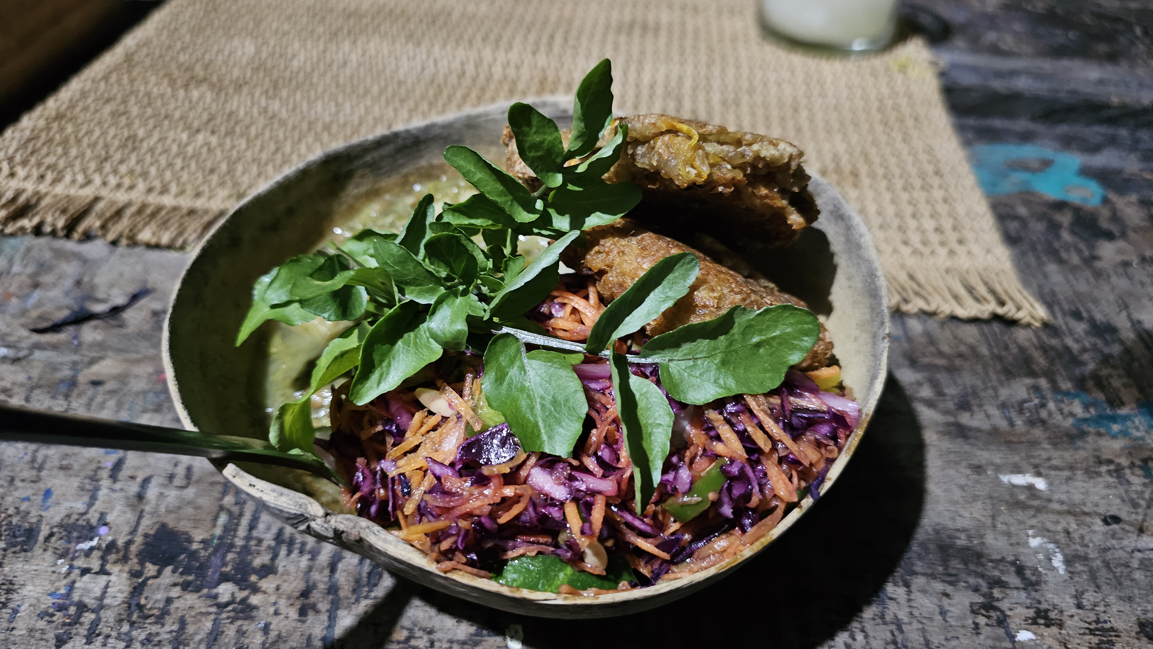 And wonderful vegan coconut curry made with local home grown vegetables including yams and served with fresh salad and rice. This was presented in homegrown calabash bowls.