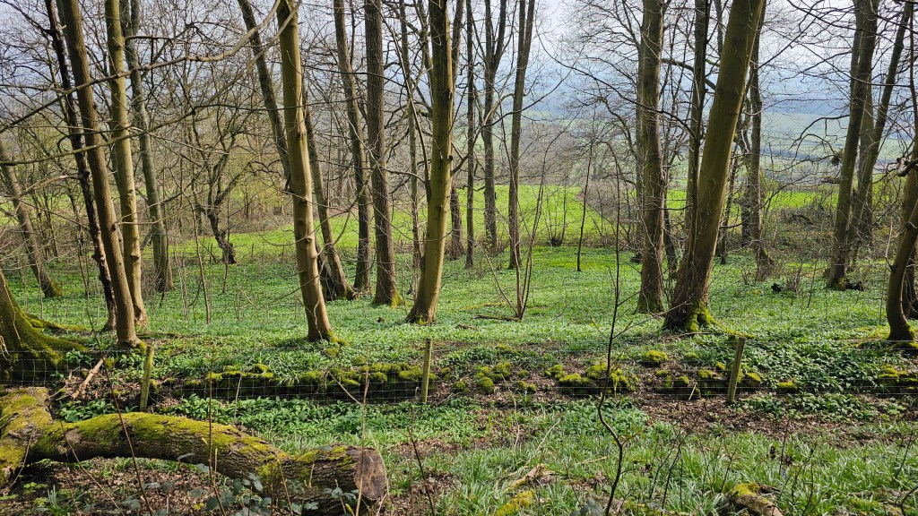 At the foot of the Malvern Hills we made our way across swampy uneven and muddy fields until we started to ascend back up into the hills. Wild garlic was growing in abundance and some small bluebells were starting to appear.