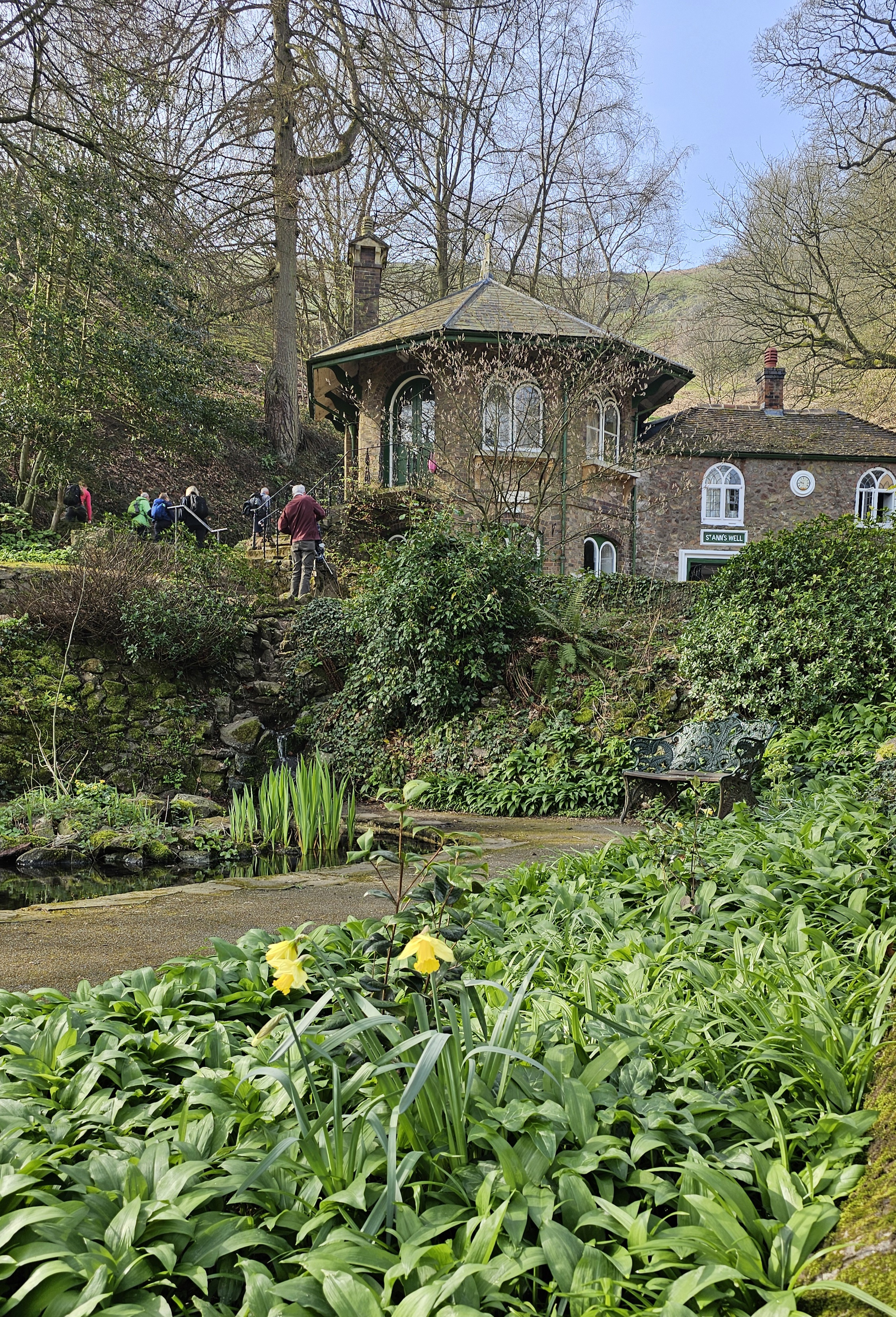 Named (unsurprisingly) after St Anne, we soon came to St Anne’s Well which is home to a spring. This is the small pond in the front of the above photo. By now blue skies were emerging as the sun had begun to break through the mist.